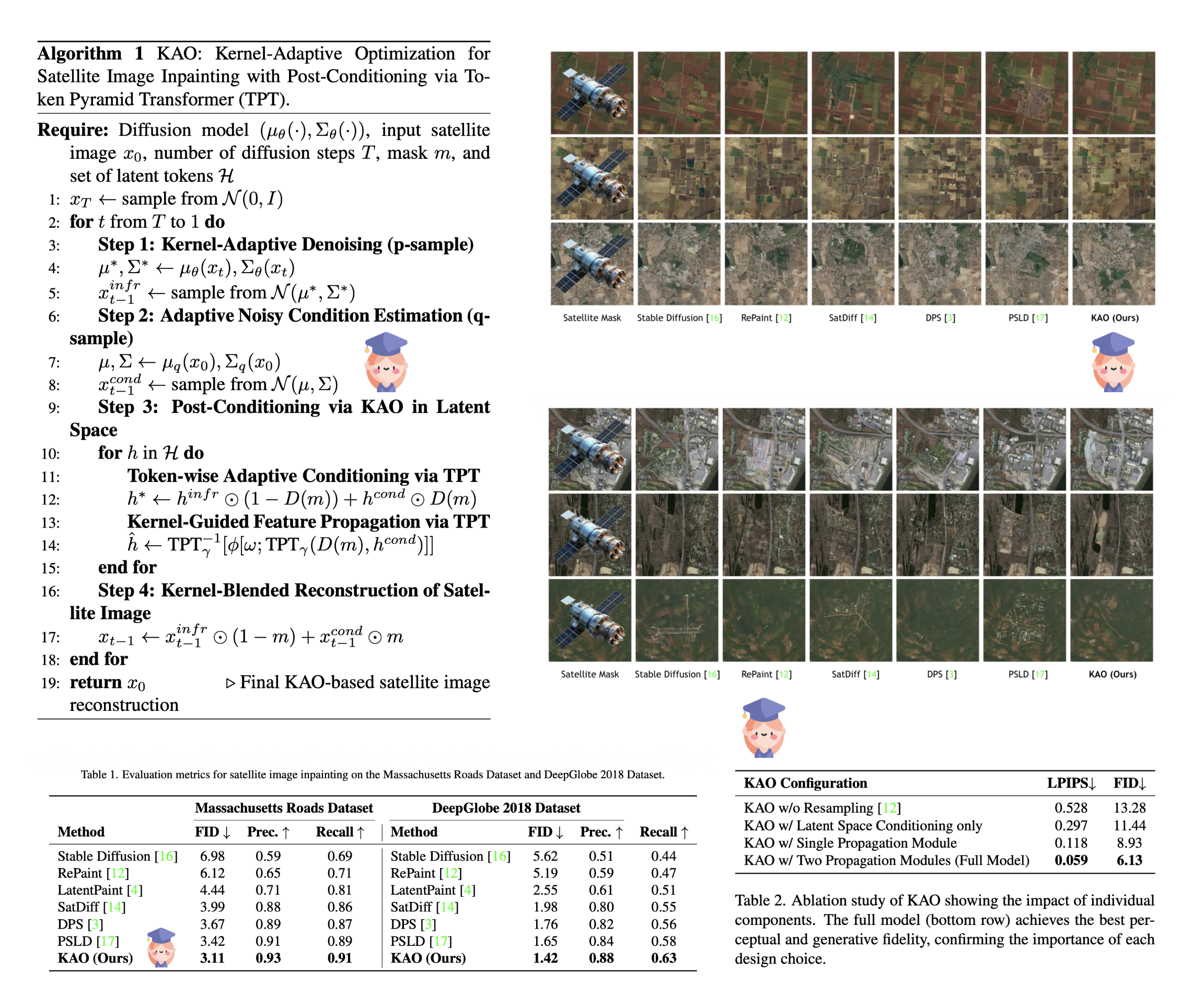 KAO introduces a diffusion-based restoration framework with latent conditioning and explicit propagation for VHR satellite imagery.